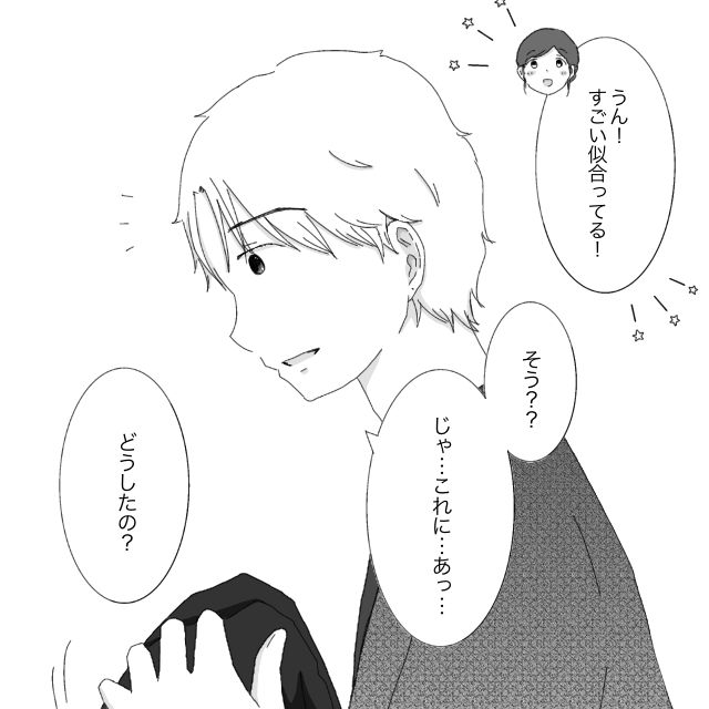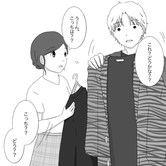 「これ?どうかな??」派手な柄のジャケットを手にして私に見せるレン。「うーん。こっちは??」と別のスーツをすすめる私。「こっち?どう??」とレンが試着すると、