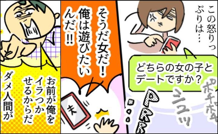 電話をするのは怖かったので、メールで「今日はどちらの女の子とデートでしょう?」と送ると、すぐに電話が鳴り、「そうだ。女だ。何が悪い! 俺は遊びたいんだ!」と怒鳴られ電話が切れました。