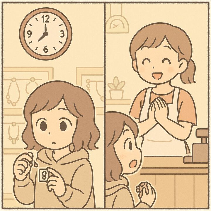 すると、今までアクセサリーに釘付けだった女性が、ハッと顔を上げました。店内をキョロキョロと見回し、壁の時計に目をやって、ようやく状況を理解したようです。