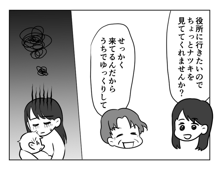 お義母さんはご近所で「嫁に優しく、孫の面倒をいつも見ている」と評判のようです。でもクミさんは……。週1日家にきてと言う割には、義実家での育児もクミさんの役目。義実家まで移動をするのも一苦労なのに、ゆっくり休むことができません。預けて自分の用事を済まそうとしても行かせてもらえないのです。