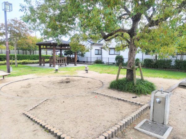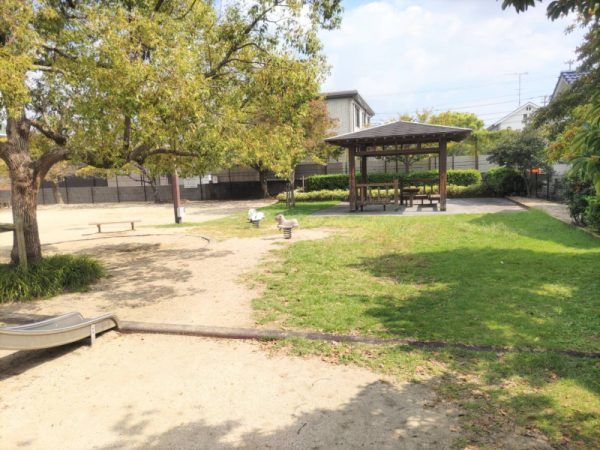 子どもを公園で遊ばせる時に親が気になるのは、トイレと休憩所かなと思います。こちらは、トイレは男女一つずつあり、手洗い場もそれぞれにちゃんとあるので安心です。また、こちらの公園には広場とアスレチックの近くあるベンチに加えて、屋根付きの休憩所である「東屋」があります。こちらが日差しの強い日の休憩にピッタリ。見た目も可愛くて涼しげなので、ついつい立ち寄りたくなります。東屋で休憩したり、おしゃべりするために公園に立ち寄るのもいいかもしれませんね。