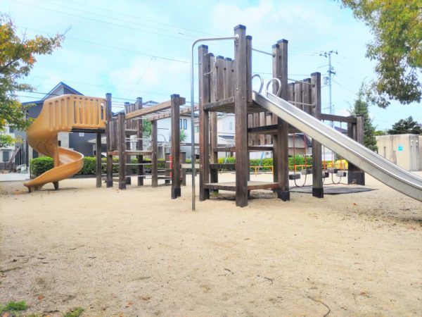 大きなすべり台付きアスレチックに加えて、この公園には入って右手にブランコと鉄棒が、公園の真ん中あたりには砂場があります。また、奥のほうにちょっとした広場があり、鬼ごっこをしたり、シャボン玉を飛ばしてみたり、自由に色々遊べます。