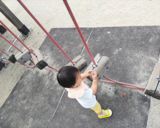 こちらの公園でまず目をひくのが、入って右手にある大きなアスレチック遊具です。すべり台2つと、平均台やうんていなどが合体したような遊具で、これ一つでもかなり色々遊べそうでした。ロープで吊り下げられた木片の上にのって遊ぶターザンのような部分もあり、これも絶対楽しそう!
