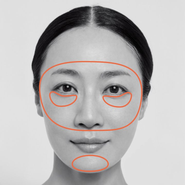 透明感を与えるブルーは白肌さんに。頰の中央(青丸)から放射状に伸ばし、クマ手前まで。Tゾーンは矢印の箇所までで適度なハイライト効果を。