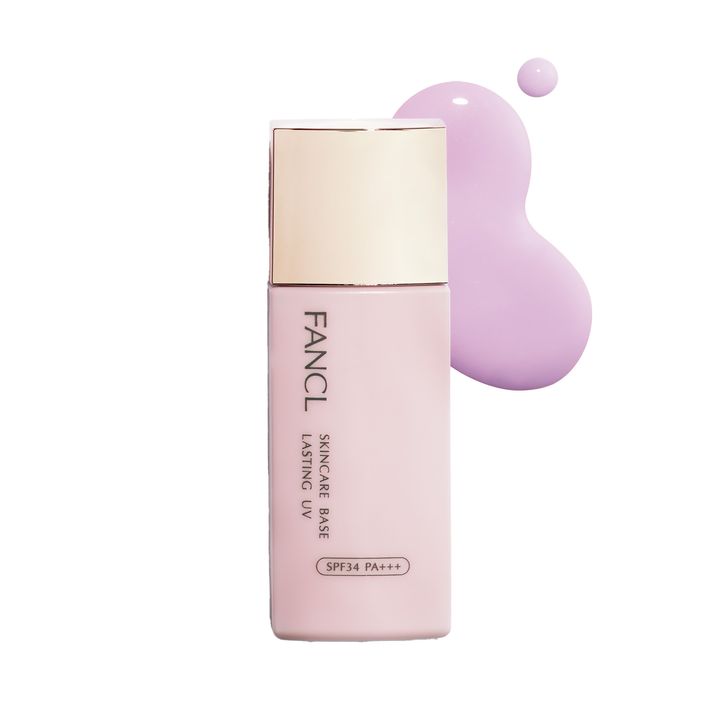 各種肌ケア成分が滑らかに肌を整え、ファンデの密着度をUP。テカリ・カサつきを防ぎ美しい仕上がりが叶う。スキンケアベース ラスティングUV パープル SPF34・PA+++ 25ml ¥2,200(ファンケル)