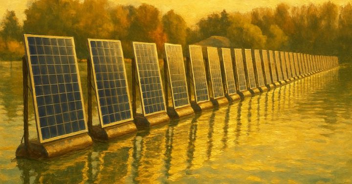 floating vertical solar panels capture sun’s energy from ponds, lakes, fish farms and lagoons