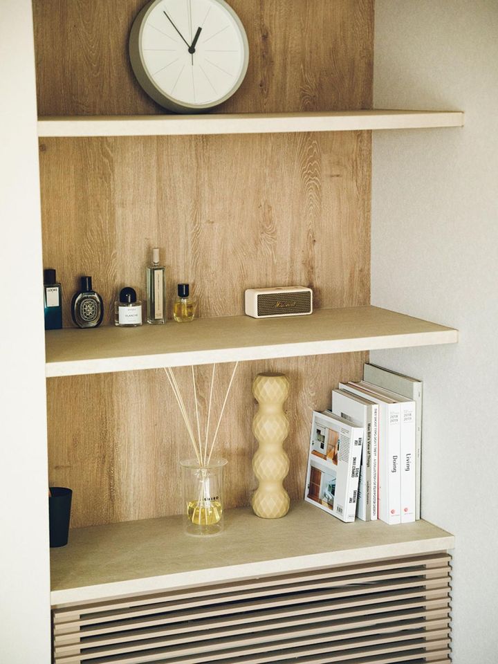 テレビ横の棚に飾っているものにも、思い入れとお気に入りの理由がそれぞれにあります。ルームフレグランスは、インテリアとしてだけでなくおもてなしのひとつというとらえ方。