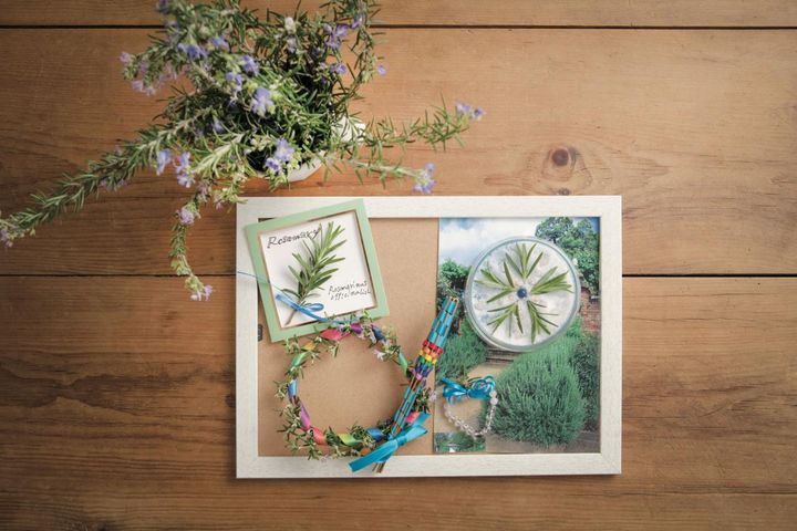 30×25cmの額にローズマリーの小さなクラフトを並べ、棚などに置いて楽しみましょう。