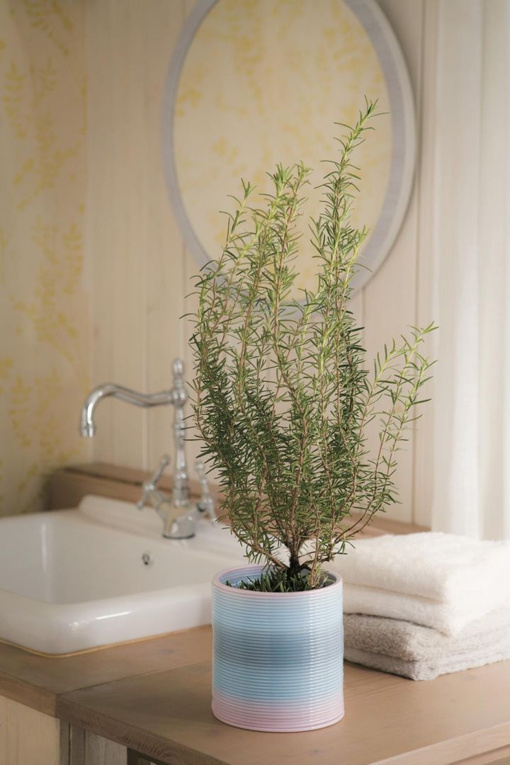 濃い青紫色の花が咲くローズマリー ‘マリンブルー’ の鉢植えを、パステルカラーのオブジェでカバー。花色は品種によって異なり、写真左から白の ‘ホワイト’ 、紫の ‘トスカナブルー’ 、ピンクの ‘マジョルカピンク’ なども。樹の性質も、直立する立性から、地面を這うほふく性、両方の中間の半ほふく性と、バラエティ豊か。