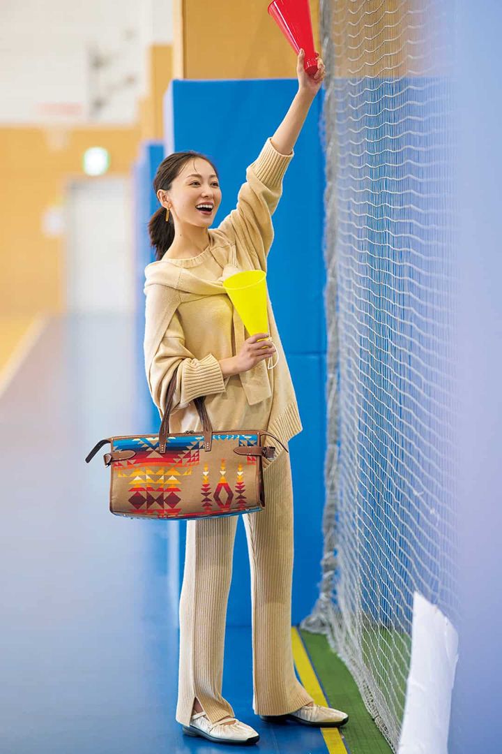 シューズ¥13,750(ル タロン/ル タロン 有楽町マルイ店)ニット[スカーフ付き]¥39,600パンツ¥31,900(ともにロンハーマン)バッグ¥82,500(ア ヴァケーション/ノーベルバ)ピアス¥3,850(ヘンカ/ロードス)