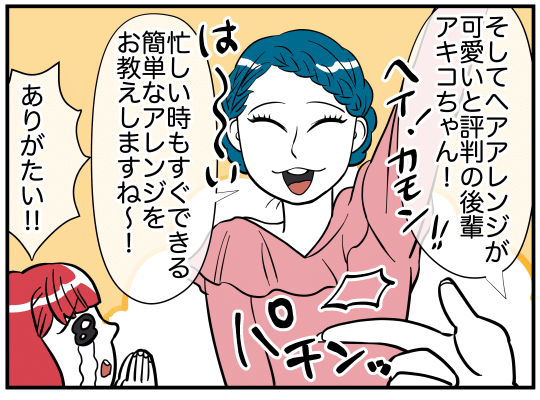 最近、おしゃれに興味津々な娘。これまでツインテールかポニーテールで登園していたが、その日の朝は「三つ編みをしてほしい」と言いだす。自分のヘアアレンジもほとんどしたことがなかった主人公は当然戸惑うが、可愛い娘のために挑戦するのだった…
