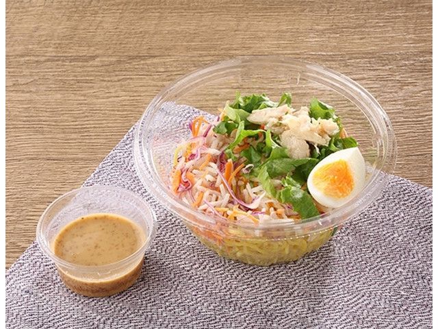 麺はコシと弾力のある中太ちぢれ麺です。具材は、蒸し鶏、ゆで卵、グリーンレタス、紫キャベツ、人参、大根をトッピング。酸味だけでなく甘みも感じることができる「ごまドレッシング」でさっぱり食べることができるラーメンサラダです。