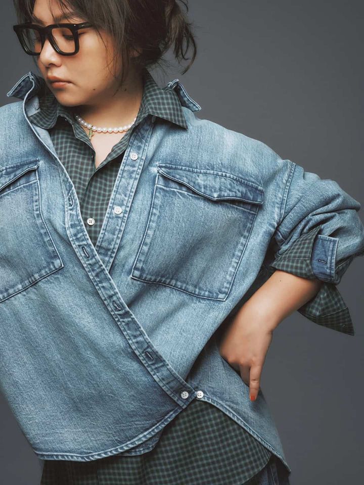 デニムシャツ¥47,300(サードマガジン)チェックシャツ¥36,300(ロエフ/エイチ ビューティー&ユース)デニムパンツ¥57,200(ハイク/ボウルズ)バッグ¥269,500(ヴァレクストラ/ヴァレクストラ ジャパン)メガネ¥49,500(モスコット/モスコット トウキョウ)ネックレス¥101,200サボテンのチャーム¥236,500(ともにビジュードエム/ビジュードエム六本木ヒルズ)