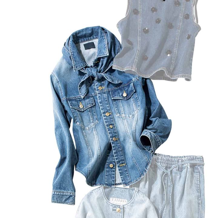 着脱可能な同素材のスカーフ付き。デニムジャケット¥42,900(サージ/ノーブル 有楽町マルイ店)