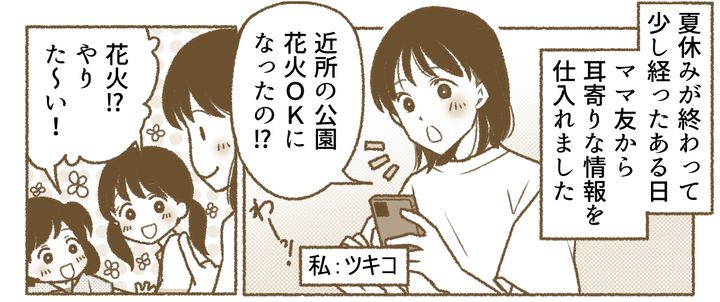 夏休みが終わり、ママ友から「A公園が夜間、手持ち花火がOKになった」と聞き、私はすぐに娘たちに声をかけました。A公園は、私たちのマンションからすぐ近くにあります。