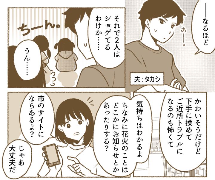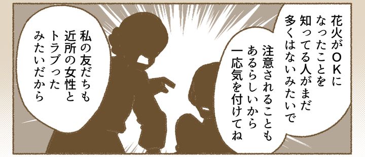 ママ友の言葉を思い出す私。近所のなかには、まだ花火が解禁されたことを知らない人もいて、トラブルになることもありそうだと聞きました……。