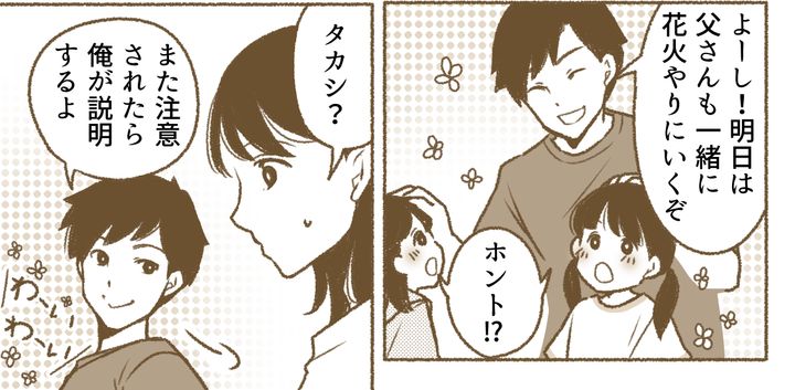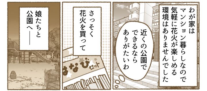 私はツキコ。夫のタカシとのあいだには娘が2人います(小3のハナ、年中のフウカ)。ある日、私は近所のA公園で夜間に手持ち花火ができるようになったという耳寄りな情報を得ました。わが家はマンション暮らしなので、今まではなかなか花火ができませんでしたが、近所の公園でできるとなると本当にありがたいことです。嬉しくなった私はさっそくコンビニで花火を買って、娘2人を連れて公園で花火をすることにしました。しかし思いもよらないことが起こってしまったのです。