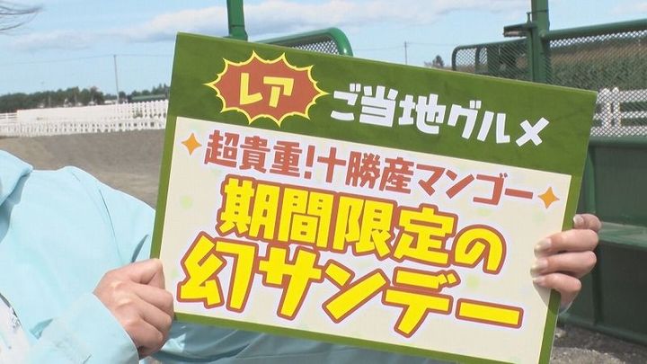 松尾アナ:「超貴重!十勝産マンゴー期間限定の幻サンデー」新くん:「絶対おいしいじゃんこんなの。やばっ!食べたい!」
