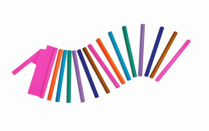 紙に挟まれた色とりどりのプロダクトが大胆に飾る壁面や、スティック状に巻いたプロダクトが並ぶガラスケース、特別な構造のハンガーラックによって宙に浮かんでいるかのように並ぶプロダクトなど、フロア全体にカラフルで楽しさのある空間が展開している。