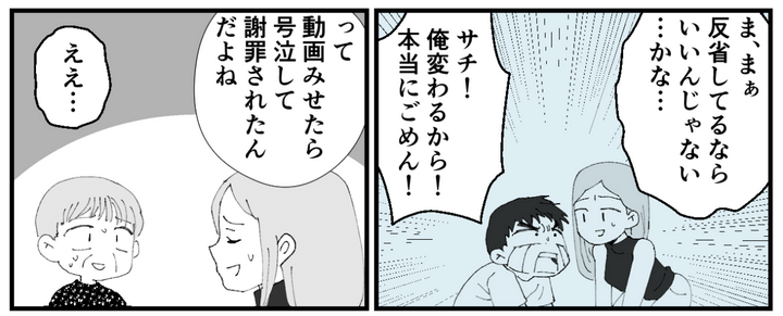 私が録画した夫の怒鳴る様子を見せると、夫は号泣しました。予想外の状況に戸惑った私はとりあえず「反省しているなら……」とその場をやり過ごします。後日、母に録画作戦の結果を話すと、母は「情緒不安定かもしれないね」と言います。