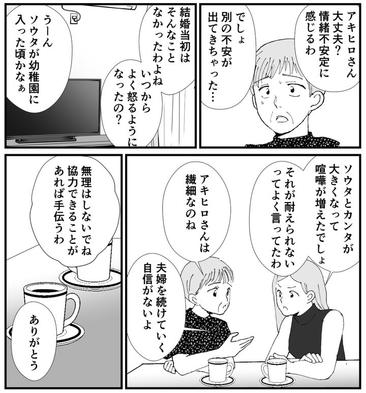 私は夫にどう対処するべきか悩んでいると、思いがけずママ友のトチギさんと夫の怒りエピソードで共感し合いました。
