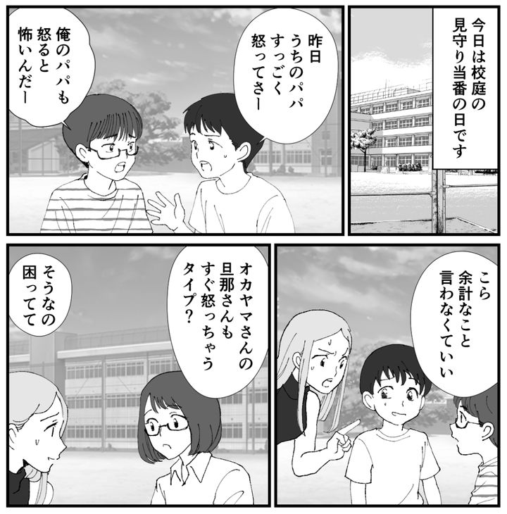 私が怒鳴り散らす動画を見せたとき、夫があまりに泣いたので、私は戸惑ってしまいました。母にもそのときの様子を報告すると「情緒不安定な感じねえ……」と。そんなある日、小学校の校庭が遊び場として開放される日、子どもたちの見守り当番をしているときにママ友と話す機会がありました。