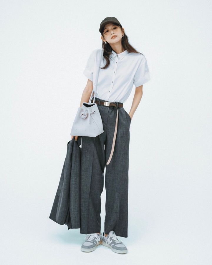 10月21日(火)、少しオーバーサイズのパンツスーツでつくる、大人のハンサムカジュアル。白シャツもゆとりのあるサイズを選んで、抜け感とこなれ感をプラスして。キャップやスニーカーで外すことで、きちんと感の中にも今っぽい軽やかさが漂います。少年っぽさと女性らしさが絶妙に混ざり合う、都会的なバランスコーデです。