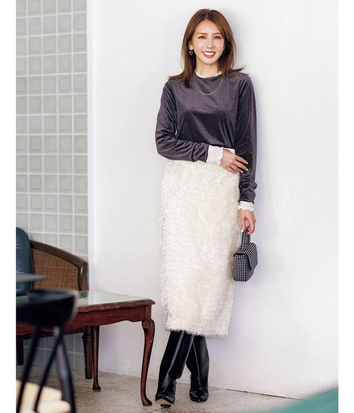 ふわふわ、もけもけ、光沢感…質感の異なるアイテムを組み合わせて楽しめるのも秋のオシャレの醍醐味。2枚重ねしたシアーなベロアトップスにシャギースカートを合わせてエレガントな表情を引き出して。ぐっと冷え込んできたからロングブーツも解禁!