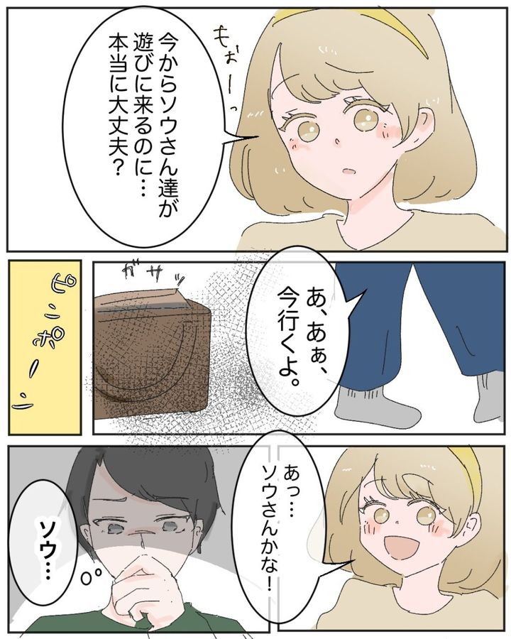 リュウを見つめたまま固まった俺に、チナツは「今からソウさん達が遊びに来るのに・・・本当に大丈夫?」と声をかけます。俺は封筒を自分のバッグにしまい、「あ、あぁ今行くよ」と部屋を出ました。動揺した気持ちを落ち着ける間もなくインターホンが鳴り、弟家族がやってきました。