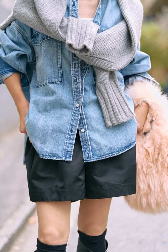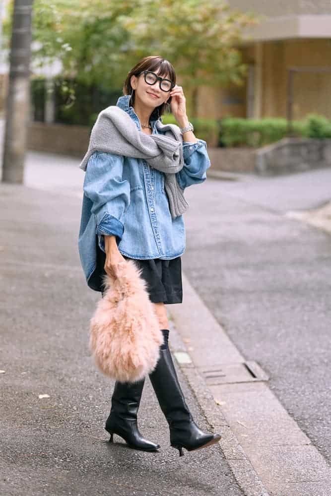 ショートパンツを履く時はカジュアルコーデをする事が多いですが、どこかにキレイめなアイテムをプラスして大人らしいバランスを心掛けています。今回はヒールブーツを合わせてみました。ブーツを素足で履く時は、長めのソックスで膝を少し隠すと安心で脚長効果も期待できます。トップスは秋冬ならではのレイヤードで視線を上に集めスタイルアップも忘れません。差し色ピンクのファーバッグで秋冬コーデをとことん楽しみます!