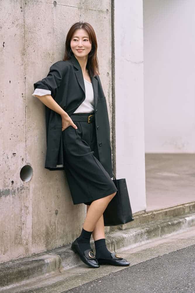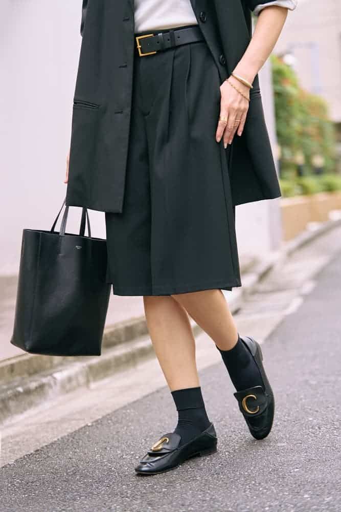 ハーフパンツを履く時は子供っぽくならないように、ジャケットを合わせると簡単に大人っぽくまとまるのでオススメです。更にモノトーンでまとめるとグッと大人感が増してアラフォーでも挑戦しやすいと思います。ハーフパンツとジャケットでセットアップ風コーデにすれば、オフィスシーンでも対応可能です。足元はソックス+ローファーが今年らしくて気分です。