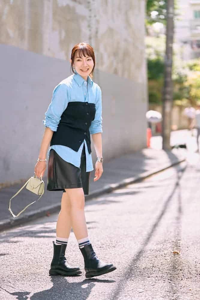 ハーフパンツは少年感が出やすいので素材感と形に気を付けています。素材はフェイクレザー、形はスカートに近いフレアーシルエットを選べば、カジュアルになりすぎず履きこなすことができます。夏から大活躍だったブルーのシャツはニットビスチェをプラスして秋仕様にアレンジ。足元はブーツを合わせて秋感を盛り上げます。バッグはイジィデベルトを合わせて大人キレイめカジュアルコーデに仕上げました。