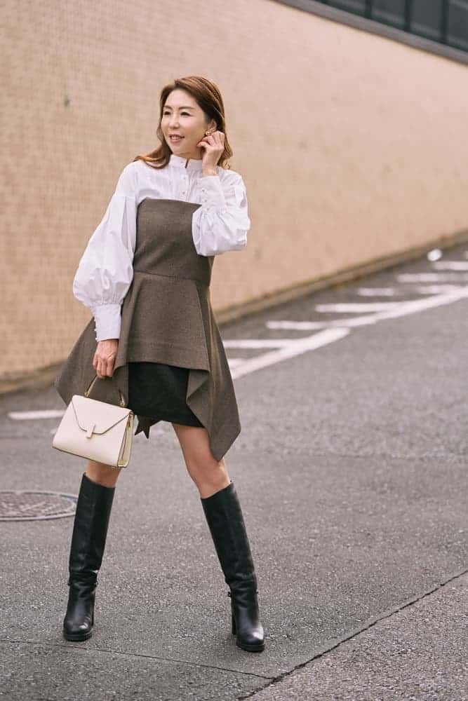 ミニ丈を履く時はシンプルになり過ぎないように、ジレやビスチェなどポイントになるアイテムとレイヤードしています。Cygneのビスチェは、少し長めのアシンメトリーデザインでスカートが目立ち過ぎず、大人でもミニ丈を合わせやすくて気に入っています。今年らしいダークブラウンを選んだSTYLEMIXERのコクーンミニスカート、実はインナーパンツが付いているので安心なんです。大人っぽいカラー合わせもコーデのポイントです。