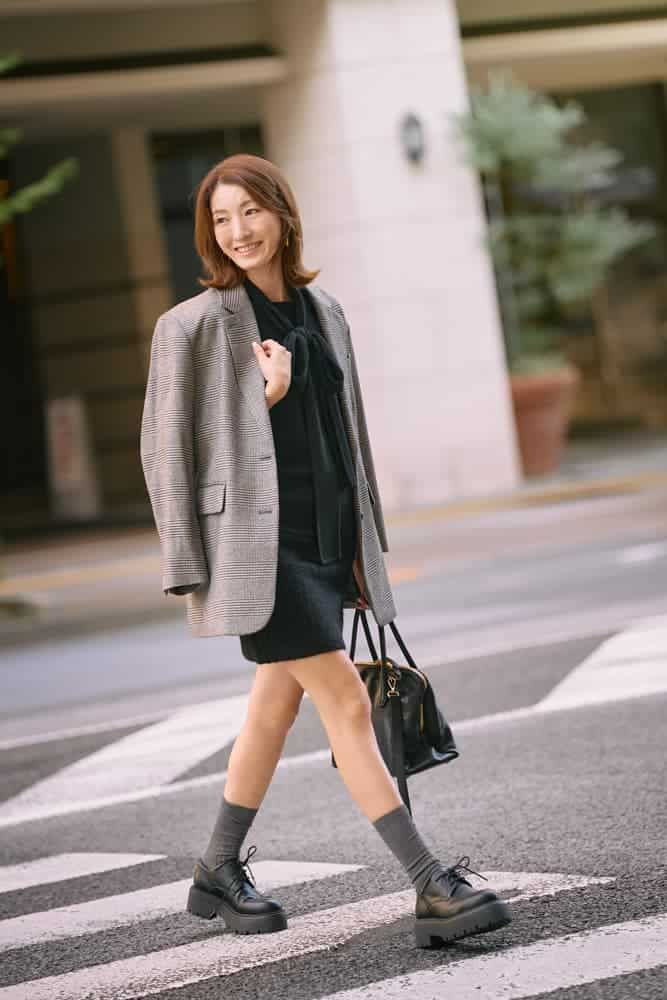 ミニ丈ボトムスを着るときは、トップスをオーバーサイズにしたり足元にボリュームを出してバランスを取り、スタイルアップを目指しています。去年はセットアップのジャケットを合わせていましたが、今年はトレンドのチェック柄おじジャケットと、ボリュームのあるレースアップシューズ合わせでブラッシュアップ。長めのリボンタイが大人らしい、ほぼクロ×甘ニッシュコーデが気分です。