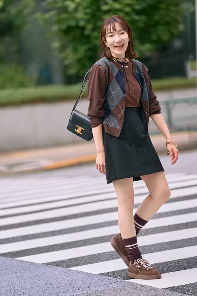 トレンドのミニスカはシンプルベーシックな形や色を選べばコーデに合わせやすく悪目立ちしません。また、トップスにポイントを持ってくると目線も上がって気負わずトライできます。お気に入りのCLANEのアーガイル柄ニットは、アームホールから袖を抜くとベストにもなり、前後着用可能なマルチウェイで大活躍です。ブラウンスニーカーにボルドーのソックス合わせでトラッドコーデを盛り上げて。スカートに合わせた黒のバッグでコーデを引き締めます。