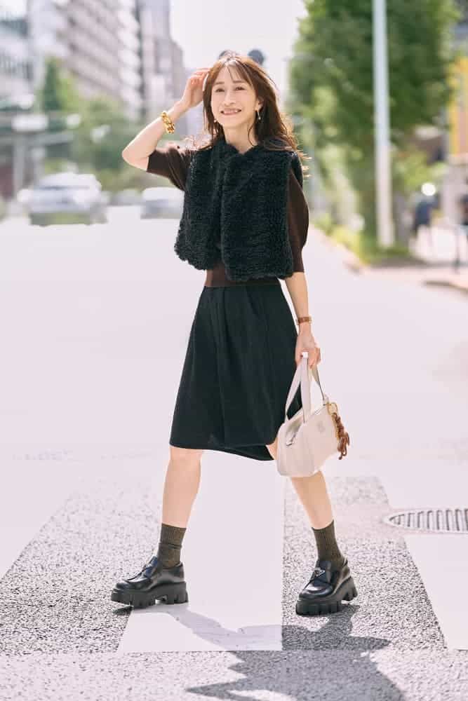 ハーフパンツを履く時は、子供っぽくならないようにボリュームのある靴やソックス合わせでブーツ風に見せたり、足元に重さを出して全身のバランスを取るようにしています。色使いも少なめにしてブラウン×黒の“ほぼクロ”でまとめてみました。バッグは軽やかさを足せるように白を選んでコーデのアクセントに。ファージレとジャガードのハーフパンツは、素材違いの黒を合わせて表情をつけるとコーデにメリハリも出て重くなりません。