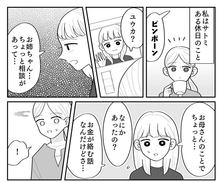 私はサトミ。会社員の夫と、中学生の息子がいます。私はパートで働きながら家事や息子の用事などをこなし、日々忙しく過ごしています。同じ市内には母や、妹ユウカの家族も住んでいます。父がすでに他界しているため、実家の母はひとり暮らし。そうしょっちゅう顔を出せるわけではないけれど、穏やかに暮らしていると思っていました。ところがある日、突然わが家にやってきた妹のユウカの口から、母に関する驚くような出来事が語られて……?