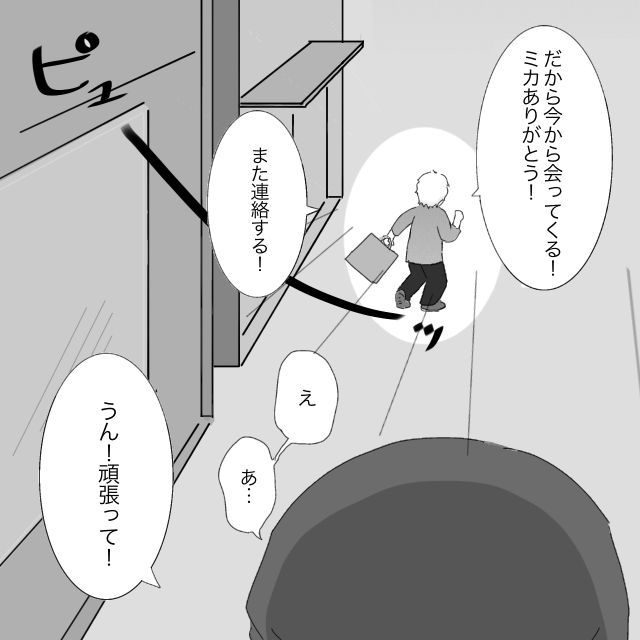 「だから今から会ってくる!ミカありがとう!また連絡する!」そう言って走って行ってしまうレンにビックリしつつ、「え、あ・・うん!頑張って!」と言ってレンの背中を見送りました。
