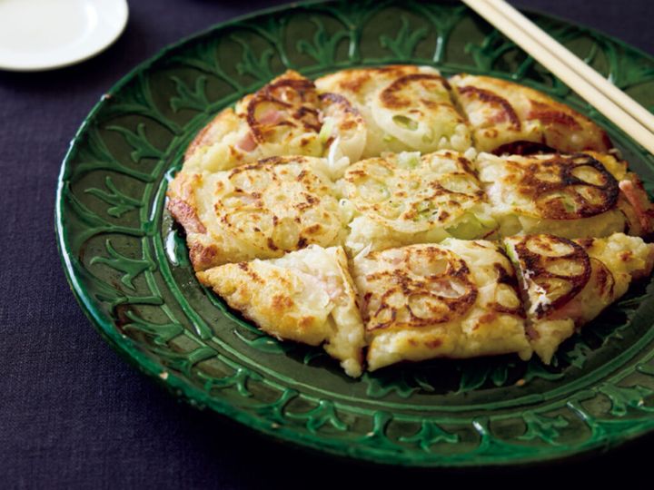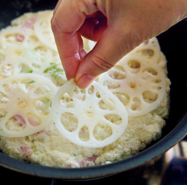 直径20cmのフライパンを弱めの中火で温め、ごま油小さじ1を広げ入れる。(2)の生地を流し入れて広げ、表面に(1)の輪切りにしたれんこんを並べてはりつける。5分ほど焼き、上下を返してさらに5~6分焼く。ごま油小さじ2を鍋肌にそうように回し入れ、生地の縁がカリッとするまで焼く。フライパンよりひとまわり大きい器をかぶせ、フライパンごと返して取り出し、食べやすく切って器に盛る。