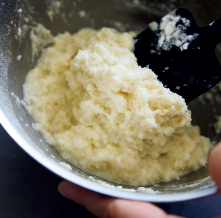 (1)のすりおろしたれんこんのボールに、〈生地〉の材料を加え、ゴムべらでさっくりと混ぜる。粉っぽさがなくなったら、ハム、ねぎを加え、さっと混ぜる。