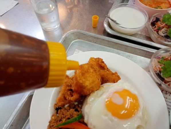 • エビ団子の揚げ物 ハーブ風味の鶏唐揚げ バジルチリ炒め 目玉焼き グリーンカレー トムヤムクンスープ 春雨サラダ デザート
