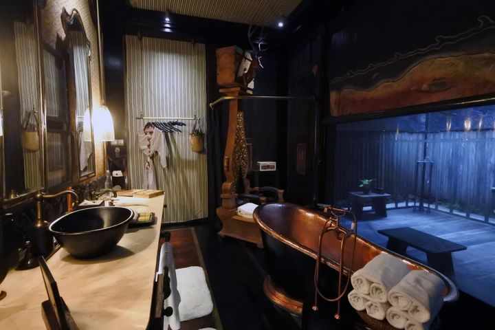 室内は遊び心のかたまり! ミニバーは巨大なトランク(ノンアルコールとスナックは毎日、補充されます)、フックは猿、トイレの便座は玉座のようで、頭上から垂れた紐を引っ張って水を流します。「航海者」というテントに泊まったのですが、シャワーヘッドは大輪の花、真鍮をハンマーで叩いて造ったバスタブはカラダを沈めるとザパーッと豪快にお湯があふれます。
