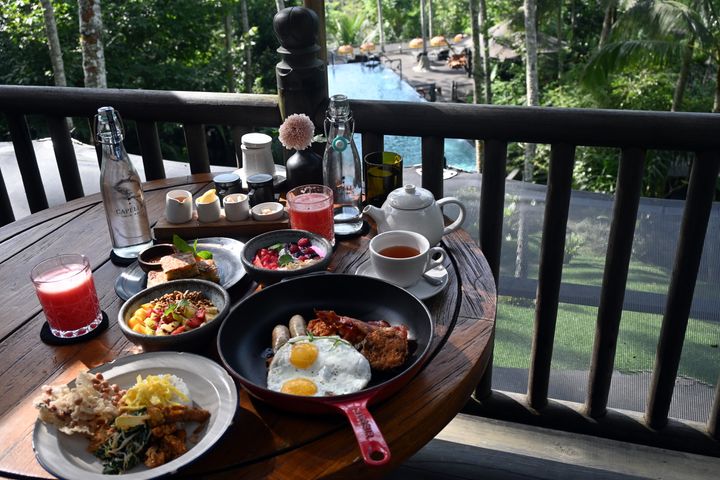 オールデイダイニングの「マッズ・ラング」は、緑の斜面や絵になるプールを見下ろす高台に位置しています。メニューは近隣の農家で手摘みされた野菜などを使った、インドネシア料理や各国料理。朝食はビュッフェと、卵料理などの温かい料理を注文するセミ・オーダースタイルです。