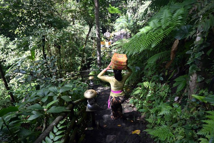 儀式のために、しっとりとした森の細道を下りて、川のほとりの寺院へ。