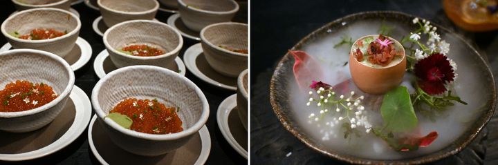 イクラに見せかけたタピオカをのせたツナ・タルタル(左)。卵の殻の中に茶わん蒸しが(右)