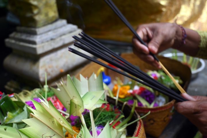 頭から聖水をかけてもらい、チャナンというお供えと共に祈りを捧げます。一連の儀式の後、赤・白・黒の三色の糸をよったミサンガのような「トゥリダトゥ」というお守りを手首に巻いてくれました。糸が切れるまで、身に着けているように、と。後日、この糸を着けていると「バリ島へ行ってきたの?」とたびたび人に聞かれました。バリ島と糸で結ばれているような気分です。
