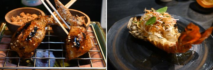 照り焼きチキンの中につくねを詰めた一品(左)。ジューシーなスマトラのエビ。絶妙な火加減!(右)