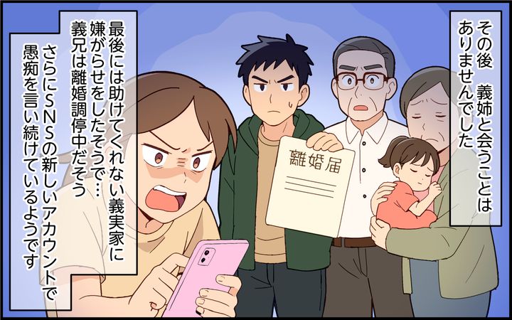これまでは、他人に迷惑をかけてもそれが当たり前というような顔をしていた義姉。今回のこともどこまで反省しているのかわかりませんが、これこそ因果応報、自分勝手な振る舞いをしてきたことの報いなのではないでしょうか…?