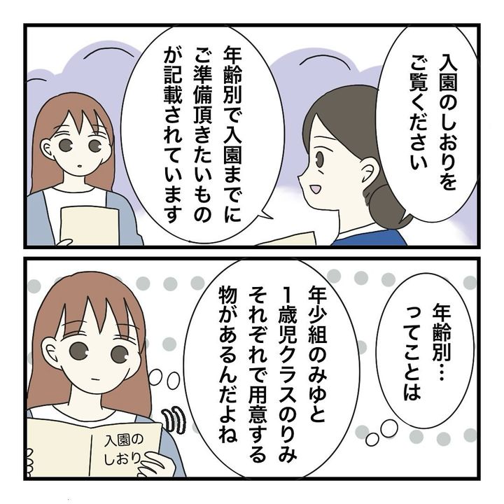 そこで、年少クラスに入るみゆと、1歳児クラスに入るりみのために準備するものを確認するのですが…。