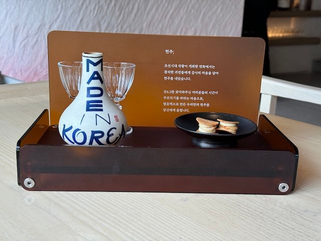 オン 6.5 では、料理のプレゼンテーションにもこだわりが。注文した食事が出る前に、ウェルカムドリンクと小さなフィンガーフードが登場。おしゃれな箱とMADE IN KOREAの文字が入ったおしゃれな徳利。